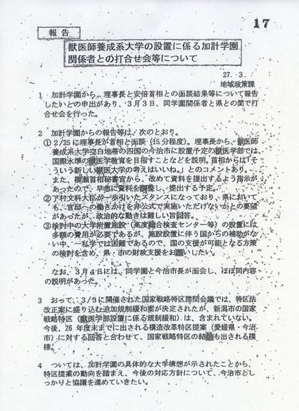 獣医学部新設を巡っては、今月10日の衆参予算委員会に参考人として出席した柳瀬唯夫元首相秘書官(現経済産業審議官)が15年4月2日、首相官邸で学園関係者と面会したと認め、愛媛県や同県今治市の関係者が同席していた可能性も認めている。文書は、面会直前の15年3月、愛媛県職員が加計学園関係者らと交わしたやりとりを記録したもの。学園関係者が県に、学園の加計孝太郎理事長が安倍首相と15年2月25日に15分程度、面会したと報告したと記されていた。同じ内容は今治市長にも伝えられたとの記述もあった。
