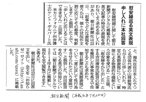 慰安婦関連の英語版記事には、日本語版には絶対に登場しない comfort women who were forced to provide sex to Japanese soldiers という表現を必ず挿入する朝日。強制連行、性奴隷化の印象操作をせっせと続けています。