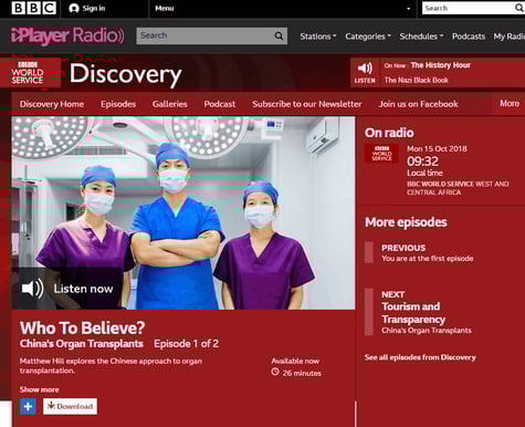 英BBCは10月8日、『誰を信じるべきか?中国の臓器移植』(Who to Believe? China’s Organ Transplants)と題する番組で、中国臓器移植産業の闇に迫った。カナダのデービッド・マタス弁護士らは近年の調査で、中国での臓器移植件数は年間10万件と推計している。しかし、ドナー数と一致せず、待機時間が数日~数週間という短さから、巨大な「生きた臓器バンク」が存在しているのではないか、と国際社会から疑いの目を向けられている。