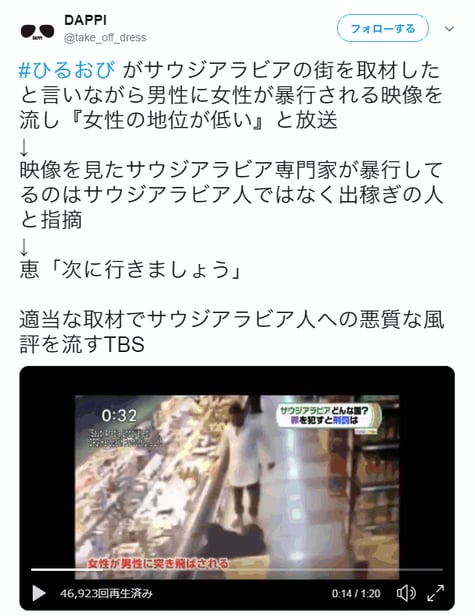 ひるおび(TBS)で「サウジアラビアの街を取材した」として男性に女性が暴行される映像を流し『女性の地位が低い』と放送