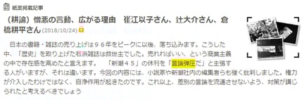 「新潮45」の休刊は「言論弾圧ではなく自浄作用」と云いながら、「取材拒否」や「行き過ぎた報道に対して公平な報道を行うように求める強制力のない申し入れ」を「安倍政権による言論弾圧」と非難している。