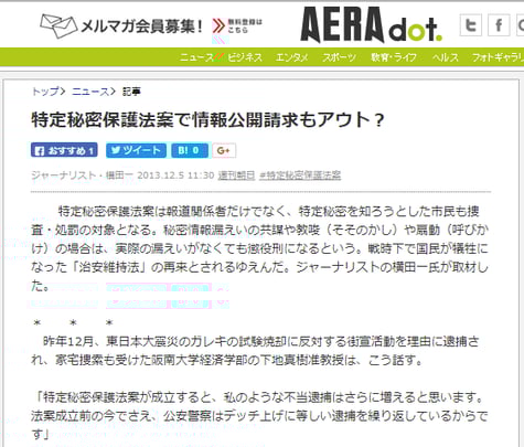 以上は、いまのところ「架空の話」である。多くの人は、まさか現在の日本でそういう逮捕などあり得ないと思うことだろう。しかし、こうしたケースで国民を逮捕し刑罰を与える法律がすでに法制化され、施行を待つだけとなっている。安倍政権が昨年末の国会で強行採決した「特定秘密保護法」である