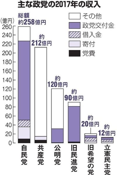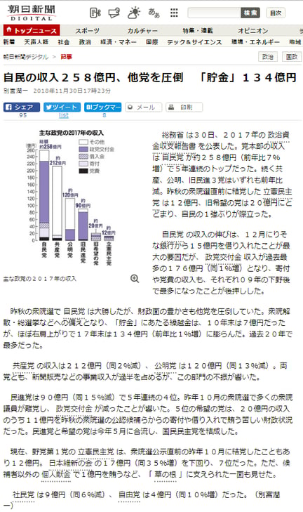 (詳細記事 「自民党の収入258億円!他党を圧倒!」 (朝日新聞))