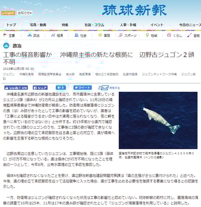 九州にまで油が流れ着いた史上最悪級のChinaタンカーの事故が起こっている。辺野古の周辺では反基地活動家による環境破壊が激しい。にも拘わらず、ジュゴンの失踪の理由を「工事の騒音」と決めつけるのはフェイクニュースだと思います。