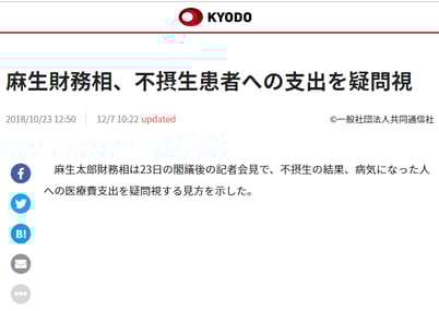 典型的な切り取り報道による印象操作。麻生さんは、不摂生が理由で病気になった人の医療費を健康のために努力している人が負担するのは「あほらしい」と指摘した知人の発言に同調しただけ。時事通信は、 『麻生氏は「人間は生まれつきがある。一概に言える簡単な話ではない」とも語り、やむを得ない事情で病気になった人の医療費を保険制度で賄うことに理解を示した。』 という一文を入れているが、共同通信はそれすらカットしており悪質。