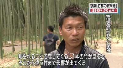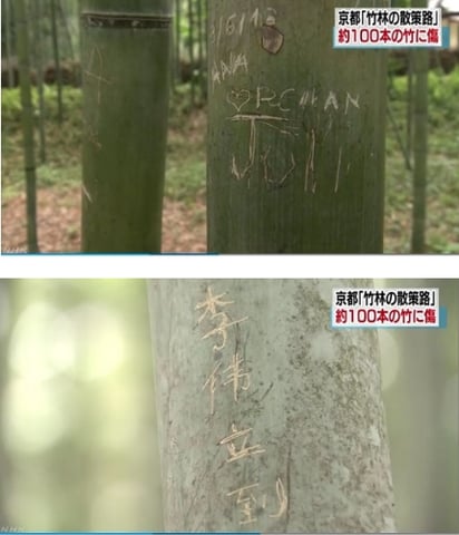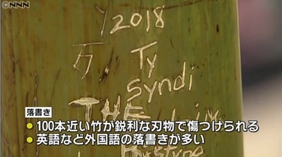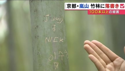 落書きが見つかったのは、京都・嵐山の観光名所「竹林の散策路」。地元の人によると、100本近い竹が鋭利な刃物のようなもので傷つけられていて、英語などの外国語で落書きされていた。