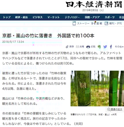 京都の代表的な観光スポット嵐山の竹林が落書き被害に遭っている。竹の幹に様々な外国語の文字が刻まれた。