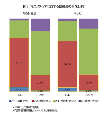 新聞・雑誌やテレビといった主要メディアへの信頼度は、欧米諸国と比較して格段に高い