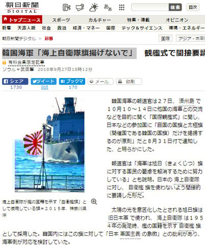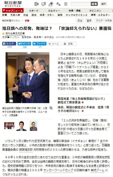 朝日新聞は2018.10.9の記事でも、韓国擁護を続けていますね。