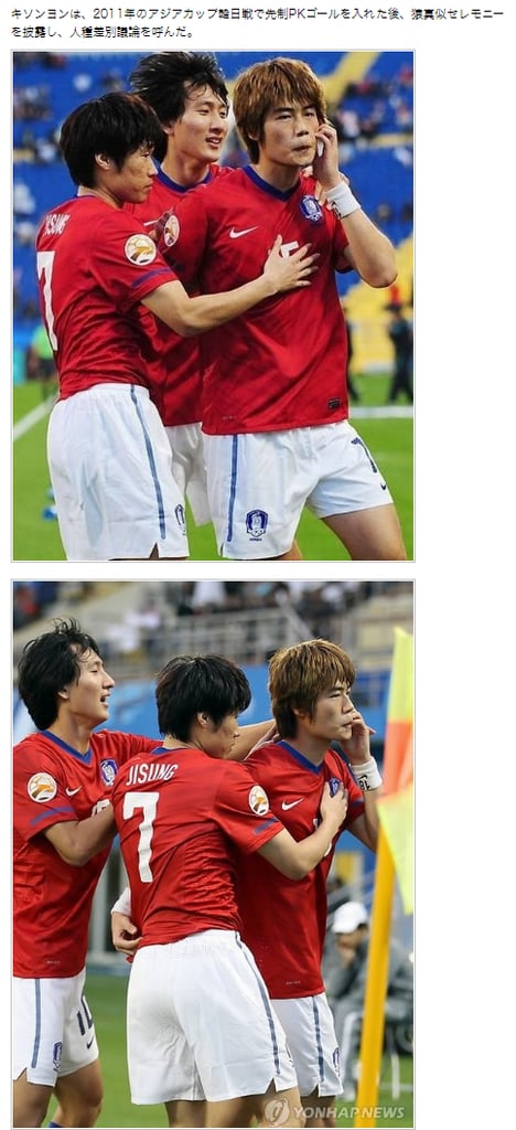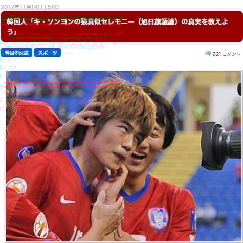 ・韓国選手の奇誠庸(キ・ソンヨン)が先制PKゴールを入れた後、猿真似(カメラの前に走って行き、頬を膨らませながら左手で顔をかくふりをした)パフォーマンスを披露