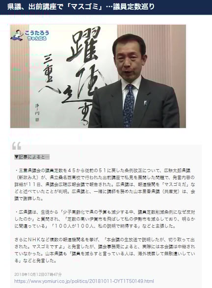 三重県議会の議員定数を45から従前の51に戻した条例改正について、広耕太郎県議(新政みえ)が、県立桑名西高校で行われた出前講座で私見を展開した問題で、発言内容の詳細が11日、県議会広聴広報会議で報告された。広県議は、報道機関を「マスゴミだ」などと述べていたことが判明。広県議と、一緒に講師を務めた山本里香県議(共産党)は、会議で謝罪した。