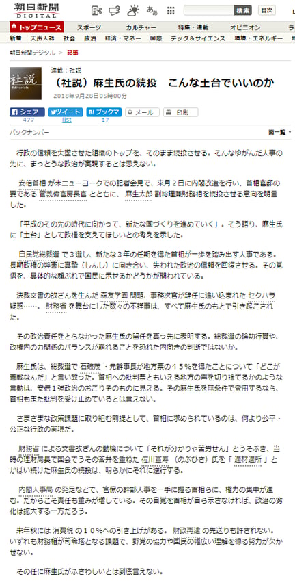 「歓送迎会で男性上司が部下の女性記者に対してセクハラしていた(週刊文春)」朝日新聞が、自社の不祥事を棚に上げて財務大臣に退任を迫るダブルスタンダード。「従軍慰安婦問題の捏造」「メタタグによる隠蔽工作」などの不祥事の責任も取って貰ってませんよ。