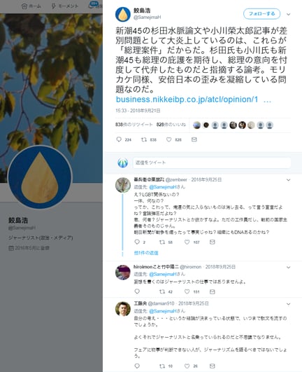 Twitterであるが、大手新聞社の報道部次長という立場の人間が、新潮45を廃刊に追い込んだ「差別問題」が、実際には「反安倍政権」という政治指向に基づく「言論弾圧」であったことを自ら暴露する内容であり、見過ごすことは出来ない。