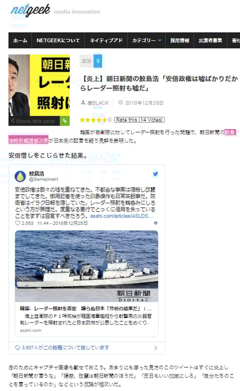 【炎上】朝日新聞の鮫島浩「安倍政権は嘘ばかりだからレーダー照射も嘘だ」