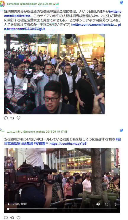 安倍総理の秋葉原演説をリアルタイムでディスりまくってた日経だが、画像をよく見ると「テレ朝、フジ、NHK、池上彰、金平茂紀」らが晒し者になっていたww。ちなみに日経は籠池が昭恵夫人に袖の下渡そうとして失敗した音声を隠した系列会社
