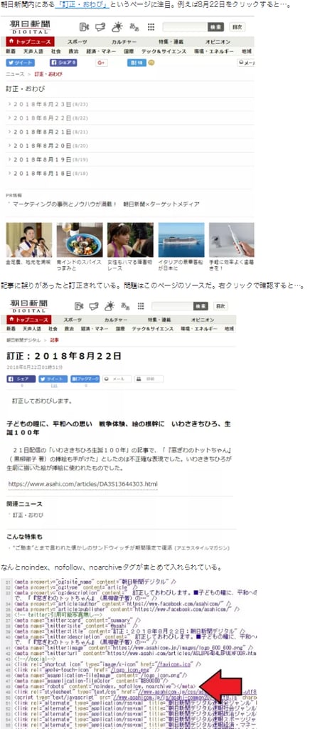 朝日新聞が「訂正・おわび」の記事に検索避けのnoindexタグを入れている謎