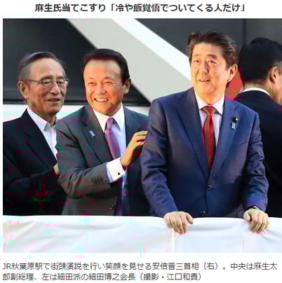 「石破氏を支持する斎藤健農相が、首相を支持する議員から辞表を書くよう求められた」「石破氏の支持議員が『総裁戦後に冷や飯状態にされる』と言われた」との記事と合わせて、安倍首相陣営がパワハラをちらつかせて総裁選を有利に進めているという印象を与えようとする切り抜き報道。