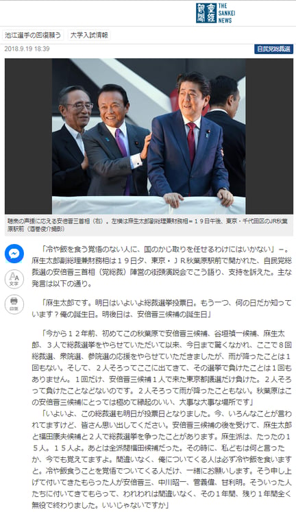 「自民党総裁選での麻生副大臣演説の切り抜き報道」