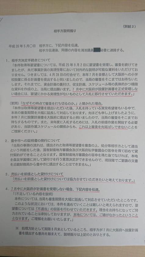 「(平成26年)7月中に大阪府が設置計画書を正式受理しない場合」という留保がつけられており、