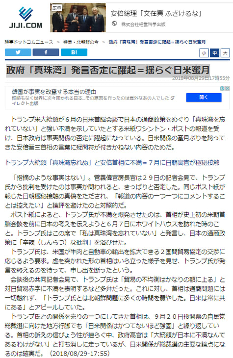 トランプ米大統領が6月の日米首脳会談で日本の通商政策をめぐり「真珠湾を忘れていない」と強い不満を示していたとする米紙ワシントン・ポストの報道を受け、日本政府は事実関係の否定に躍起になっている。日米関係の蜜月ぶりを誇ってきた安倍晋三首相の言葉に疑問符が付きかねない内容のためだ。