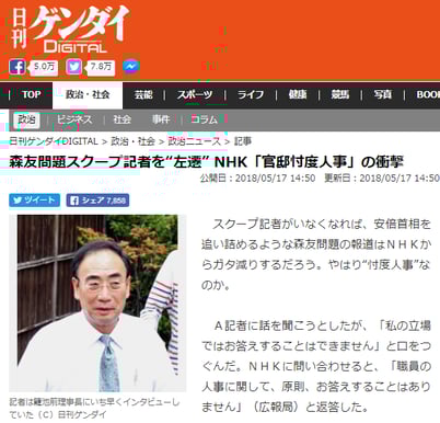 日刊ゲンダイ「森友問題スクープ記者を“左遷” NHK『官邸忖度人事』の衝撃」