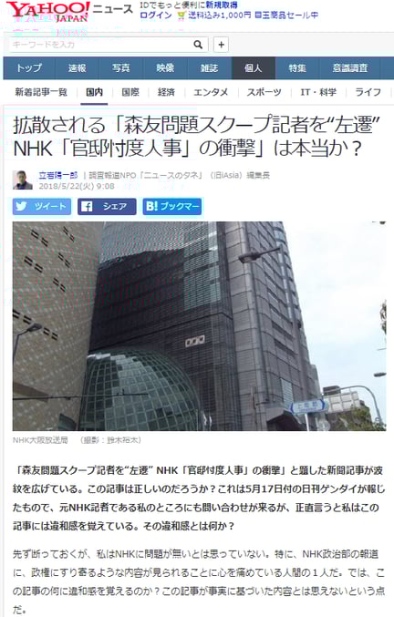 「森友問題スクープ記者を“左遷” NHK「官邸忖度人事」の衝撃」と題した新聞記事が波紋を広げている。この記事は正しいのだろうか?これは5月17日付の日刊ゲンダイが報じたもので、元NHK記者である私のところにも問い合わせが来るが、正直言うと私はこの記事には違和感を覚えている。その違和感とは何か?