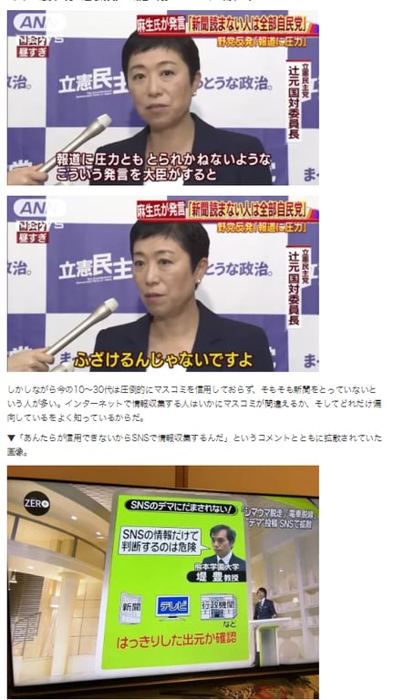 (麻生太郎財務相が「(自民党支持が高い10~30代は)一番新聞読まない世代だ。新聞読まない人は、全部自民党なんだ」などと発言したことについて)新聞を読まない人は全部自民党に来るということは、真実を、事実を伝えたら、自民党に行かなくなることを認めているわけだ。しかも、発言の中で、新聞の購読者を増やすことには協力しない方がいいよ、と言ったわけでしょ。メディアのみなさんはもっと怒った方が良い。営業妨害じゃないですか。