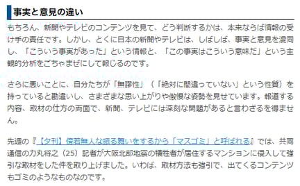 もちろん、新聞やテレビのコンテンツを見て、どう判断するかは、本来ならば情報の受け手の責任です。しかし、とくに日本の新聞やテレビは、しばしば、事実と意見を混同し、「こういう事実があった」という情報と、「この事実はこういう意味だ」という主観的分析をごちゃまぜにして報じるのです。