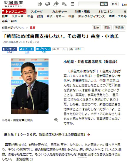 先日、麻生太郎副総理兼財相が「新聞を読まない10代から30代までの若い世代の自民党支持率が高い」という趣旨の発言を行い、これに対して共産党の小池晃書記局長が「(人々が新聞をきちんと読んで)真実・事実が伝われば、自民党支持にはならない」などと応じた、という話題がありました。