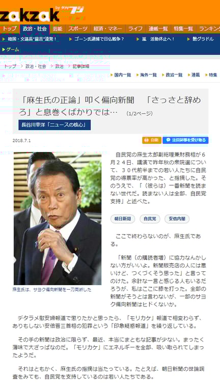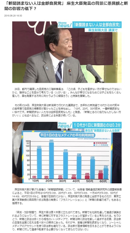 ところが、麻生副総理は昨日、これに追い打ちをかけるように、再び、「30代前半までの自民党支持率が高い理由は、新聞を読まないからだ」とする持論を展開しました。