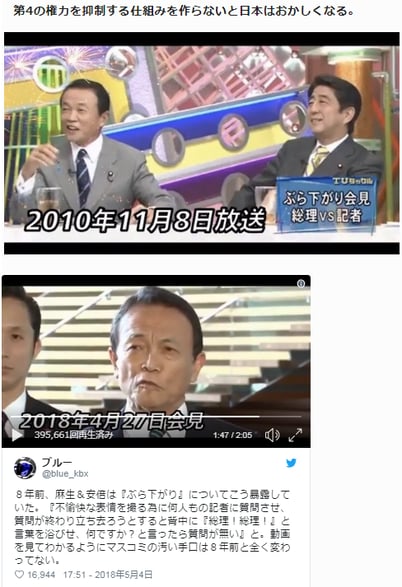 8年前、麻生&安倍は『ぶら下がり』についてこう暴露していた。『不愉快な表情を撮る為に何人もの記者に質問させ、質問が終わり立ち去ろうとすると背中に『総理!総理!』と言葉を浴びせ、何ですか?と言ったら質問が無い』と。動画を見てわかるようにマスコミの汚い手口は8年前と全く変わってない。 pic.twitter.com/QxirV0WNDq