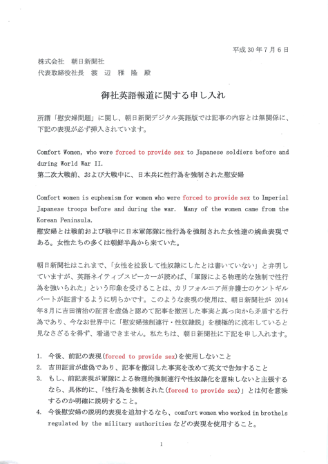 慰安婦関連の英語版記事には、日本語版には絶対に登場しない comfort women who were forced to provide sex to Japanese soldiers という表現を必ず挿入する朝日。強制連行、性奴隷化の印象操作をせっせと続けています。