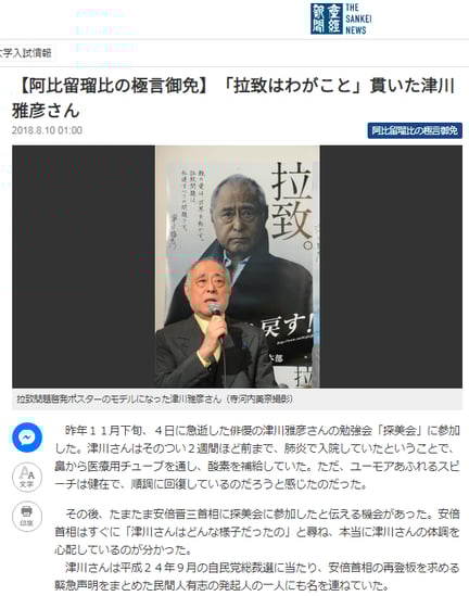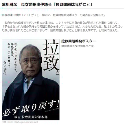 一言も北朝鮮による日本人拉致に触れないとは、さすが日頃から特定アジア(中国と南北朝鮮)に忖度している新聞だけのことはありますね。都内各所に貼られていた「津川雅彦氏の拉致問題の啓蒙ポスター」も、北の将軍様のご威光で目に入らなかったのでしょう。