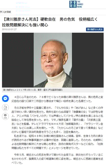 津川さんの死に顔は安らかだったと聞くが、どれほど拉致問題の解決をその目で見たかったことだろうか。北朝鮮情勢が揺れ動く今だからこそ、残念でならない。(論説委員兼政治部編集委員)