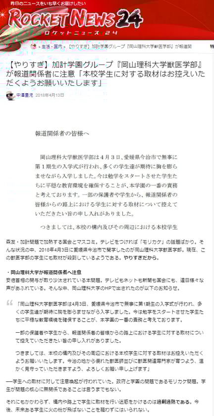 【やりすぎ】加計学園グループ『岡山理科大学獣医学部』が報道関係者に注意「本校学生に対する取材はお控えいただくようお願いいたします」