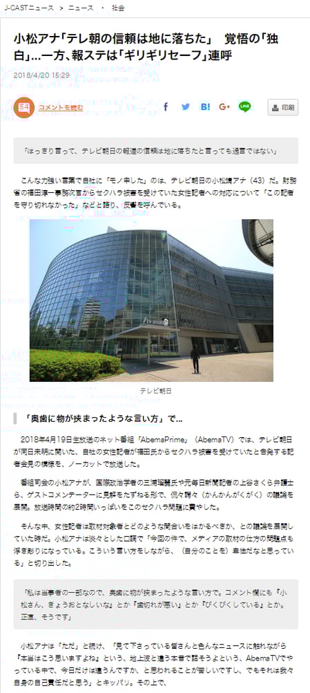 「小松アナの『テレ朝は地に落ちだった』発言。会社員なのによく言ったな」