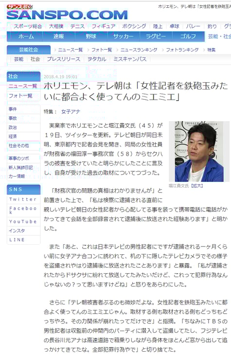 実業家でホリエモンこと堀江貴文氏(45)が19日、ツイッターを更新。テレビ朝日が同日未明、東京都内で記者会見を開き、同局の女性社員が財務省の福田淳一事務次官(58)からセクハラの被害を受けていたと明らかにしたことに言及し、自身が受けた過去の取材についてつづった。