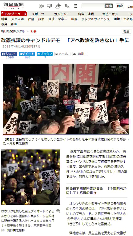 森友学園をめぐる公文書改ざんや、憲法9条に自衛隊を明記する自民党の改憲案にキャンドルを掲げて抗議するデモが14日夜、国会前であった。作家の澤地久枝さんが中心になって呼びかけ、小雨の降るなか、数百人が参加した。