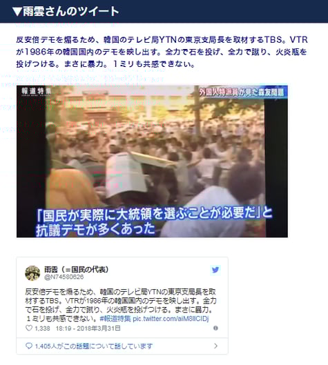 反安倍デモを煽るため、韓国のテレビ局YTNの東京支局長を取材するTBS。VTRが1986年の韓国国内のデモを映し出す。全力で石を投げ、全力で蹴り、火炎瓶を投げつける。まさに暴力。1ミリも共感できない。