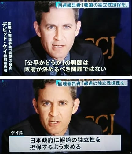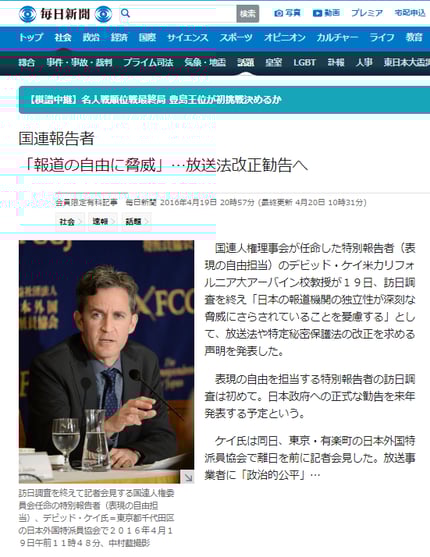 国連人権理事会が任命した特別報告者(表現の自由担当)のデビッド・ケイ米カリフォルニア大アーバイン校教授が19日、訪日調査を終え「日本の報道機関の独立性が深刻な脅威にさらされていることを憂慮する」として、放送法や特定秘密保護法の改正を求める声明を発表した。(以下略)