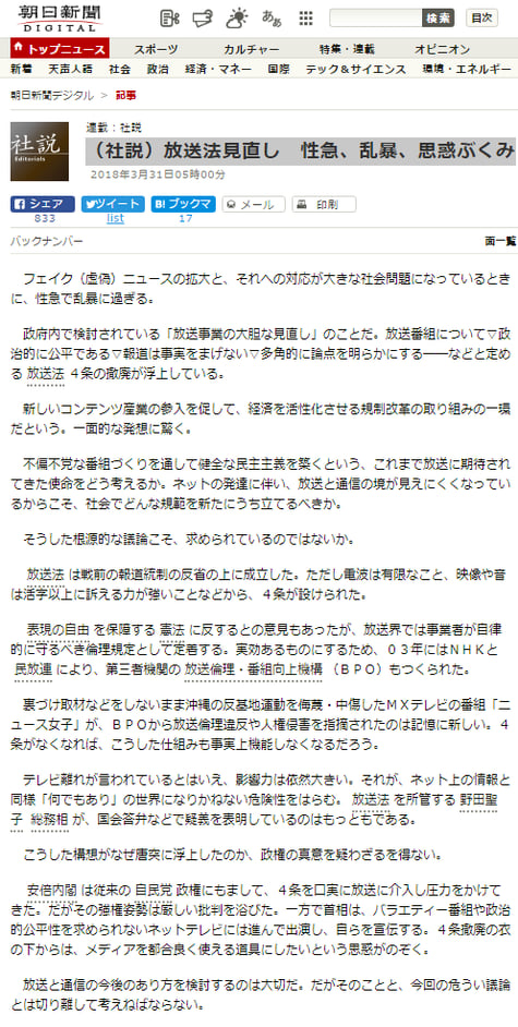 (前略) 安倍内閣は従来の自民党政権にもまして、4条を口実に放送に介入し圧力をかけてきた。だがその強権姿勢は厳しい批判を浴びた。一方で首相は、バラエティー番組や政治的公平性を求められないネットテレビには進んで出演し、自らを宣伝する。4条撤廃の衣の下からは、メディアを都合良く使える道具にしたいという思惑がのぞく。