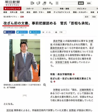 2.朝日新聞は【改ざん前の文書、事前把握認める 菅氏「首相も承知」】とのタイトルで記事を出す