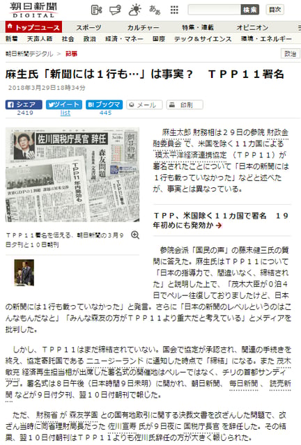 麻生太郎財務相は29日の参院財政金融委員会で、米国を除く11カ国による環太平洋経済連携協定(TPP11)が署名されたことについて「日本の新聞には1行も載っていなかった」などと述べたが、事実とは異なっている。