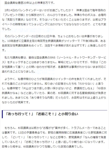 ようやく、秘書仲間のひとりが有田議員のツイッターの件を教えてくれましたが、それでも誰のことかはわかりません。知り合いの記者さんたちも「わからない」と言うし、秘書仲間で「片山さつき大臣しか思い浮かばないけど、参議院だしねぇ」「杉田水脈議員かなぁ」などと話していたら、案の定、杉田議員に対する名誉毀損訴訟が発表されました。あまりにも「あり得そうな内容」だったので、永田町はそれ以上盛り上がらなかったのが現実です。