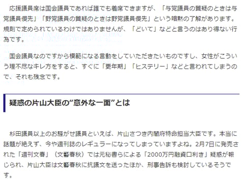 もちろん、杉田議員は以前から“お騒がせ”案件が多く、トラブルメーカーであることは事実です。12日の予算委員会でも、野党の質問時間に応援議員席にいた野党議員に対して、「どいて!」「あっち行って!」などと怒鳴り、野党議員が「なんの権限で発言しているんだ!」「お前こそあっち行け!」と言い返して小競り合いになっています。怒鳴った相手は、杉田議員がかつて在籍していた政党の議員でした。