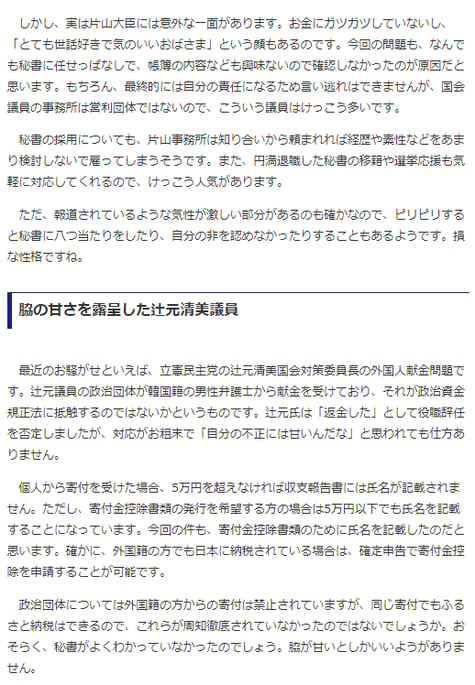 辻元氏の政治団体が、韓国籍の男性弁護士(大阪弁護士会所属)から2013年と14年、違法な「外国人献金」を受け取っていたことを、夕刊フジがスクープし、辻元氏も事実を認めた。