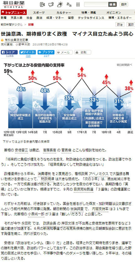 安倍は「政治はモメンタム(勢い)だ」と語る。経済と外交で期待を振りまき、選挙での勝利を最大限、政治的パワーとして生かす。この政治手法は、離合集散を繰り返した野党の自滅と非力さも手伝い、不祥事や政権へのダメージを覆い隠した。5年半は、その繰り返しといえる。(以下略)