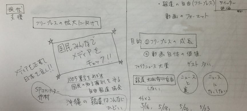 本日は、ホームページを管理して頂いているピーネクラブさんや撮影スタッフを交え、番組構成や方針・必要経費などの打合せを行いました。(下は打合せのメモ書き)