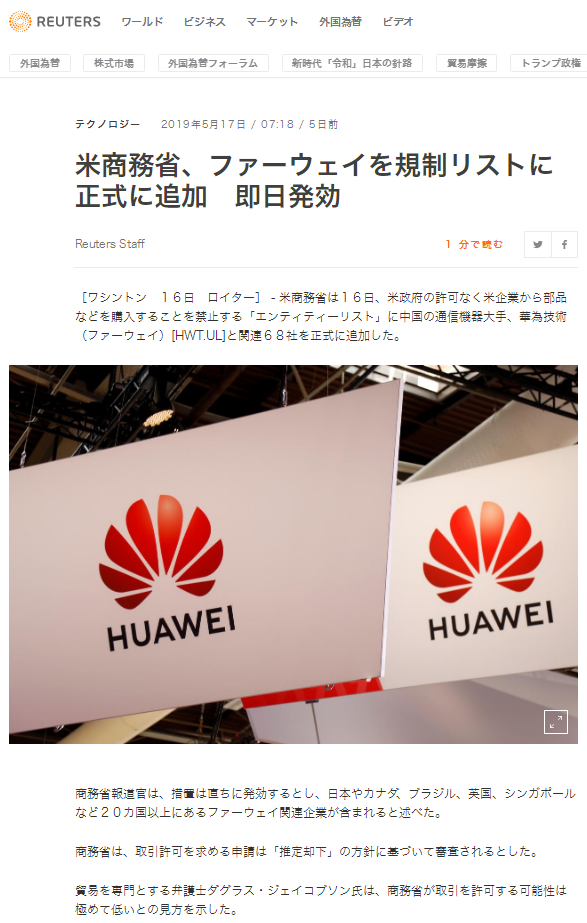例えば、日経の2019年5月17日の 米国が「報復関税&ファーウェイ」で中国を“総攻撃”いう記事でも、