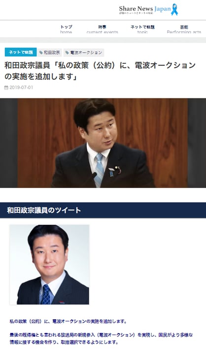 国会議員候補の中で唯一、放送法改正という難事業に取り組むことを公約として宣言して頂いた和田政宗(わだまさむね) 議員を全面的に応援することを表明します。